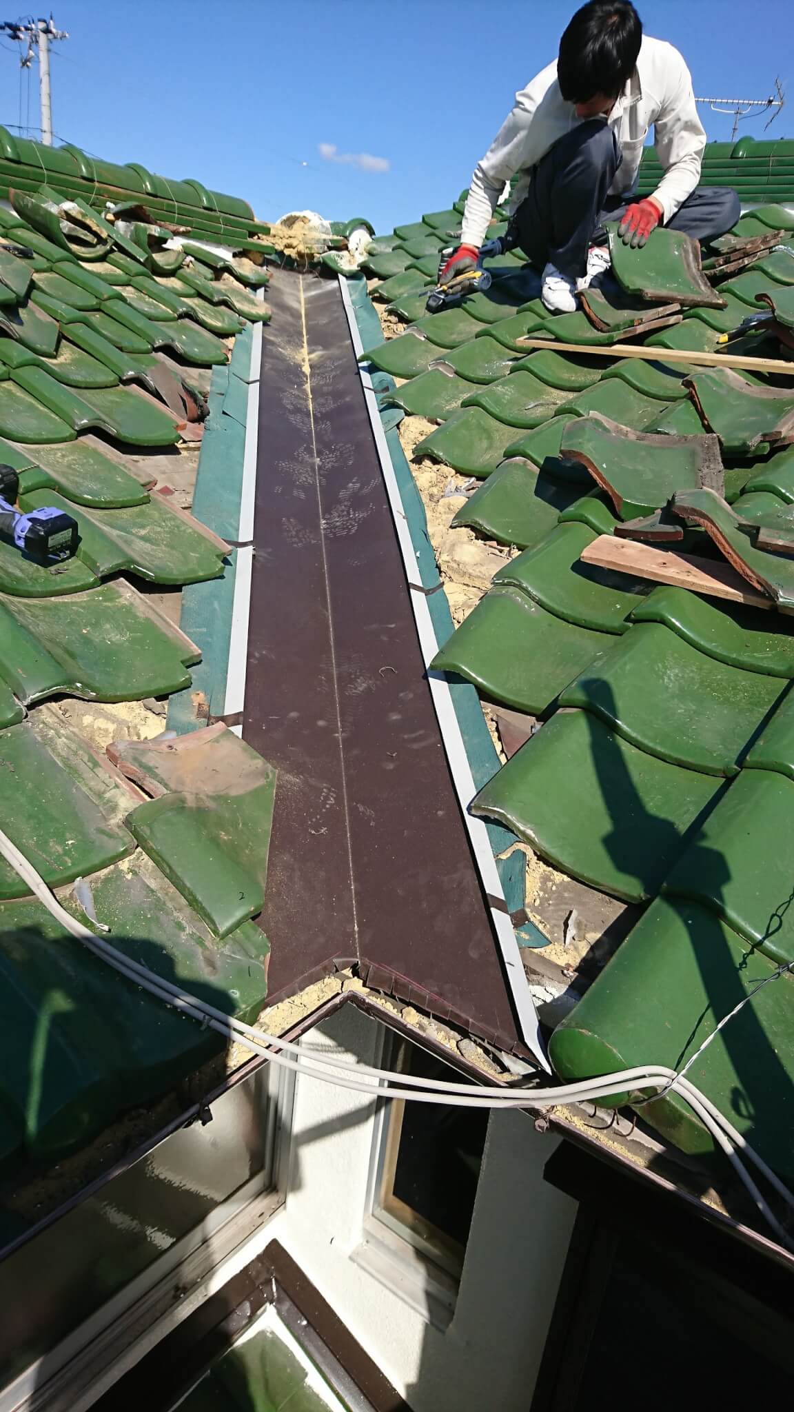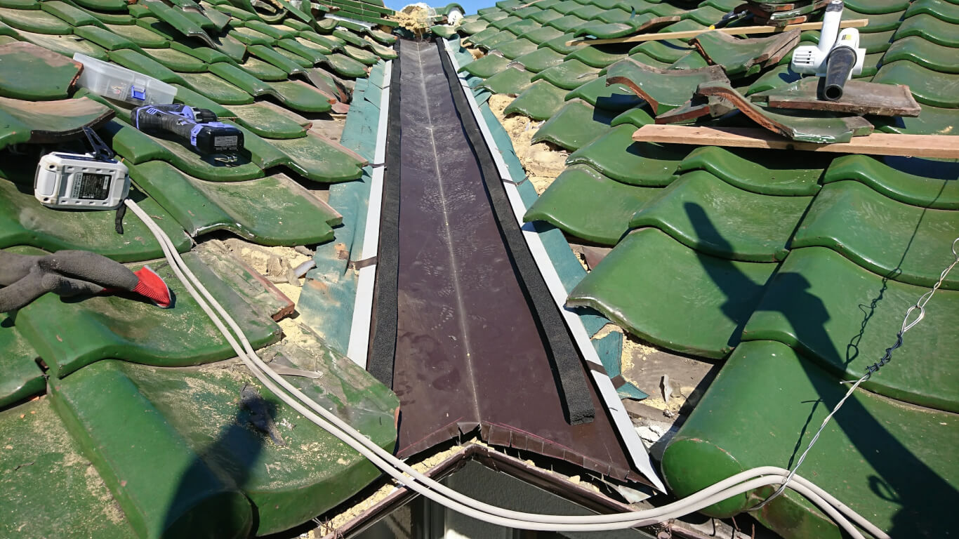 谷板交換する前に防水紙(ルーフィング)を敷いた後に、板金施工しました。